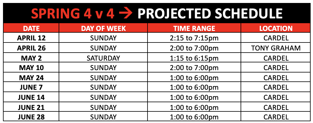 To ensure adequate numbers and a positive experience for all athletes on each date we ask that you make note of any known absences through the link below. This form will allow us to seek out any needed spares on dates that we may have a surplus of players missing to give the best opportunity to ensure adequate numbers. We ask that you submit any known absences 5 days prior to your game date when possible for our planning purposes